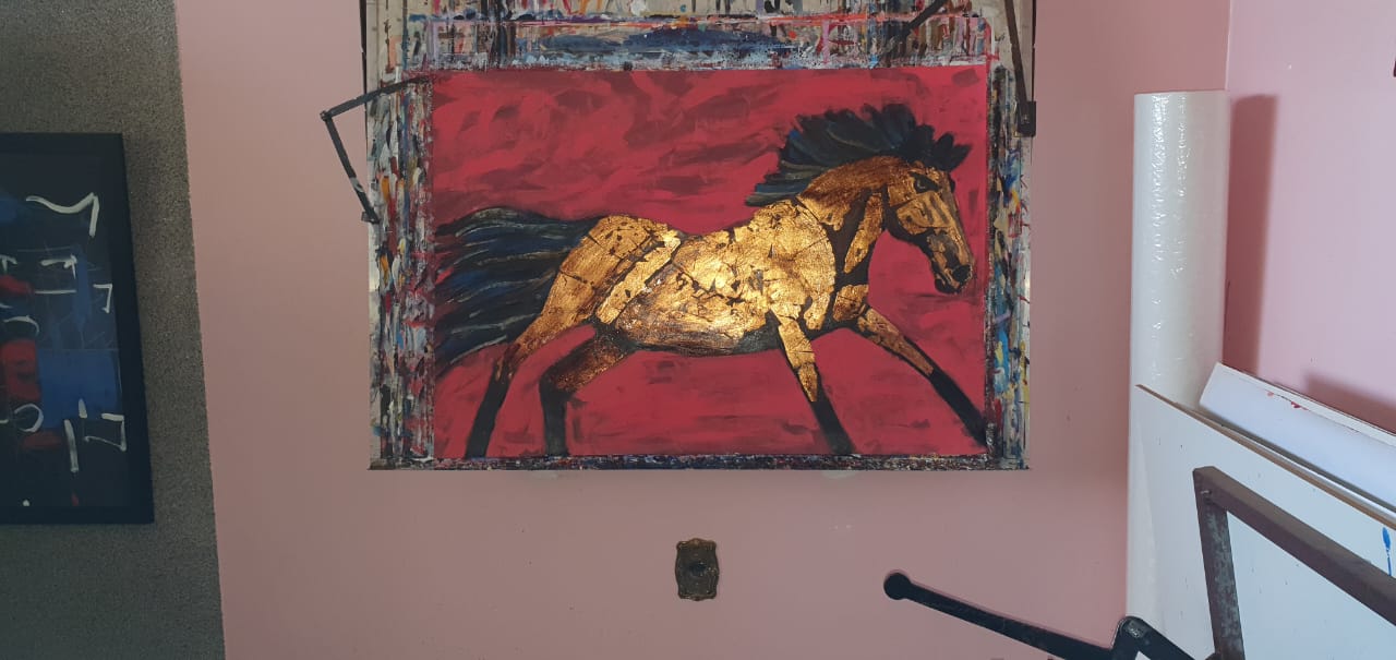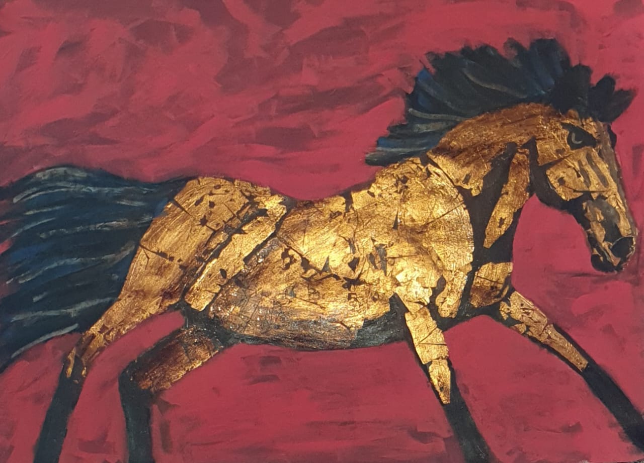 Medidas: 100 x 70 cm Tinta acrílica, folha de ouro e betume em papel