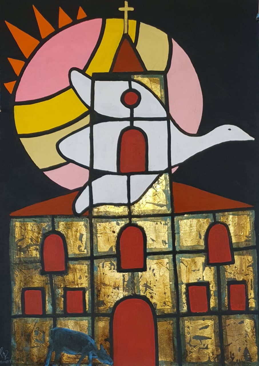 Tinta acrílica, folha de ouro e betume em papel