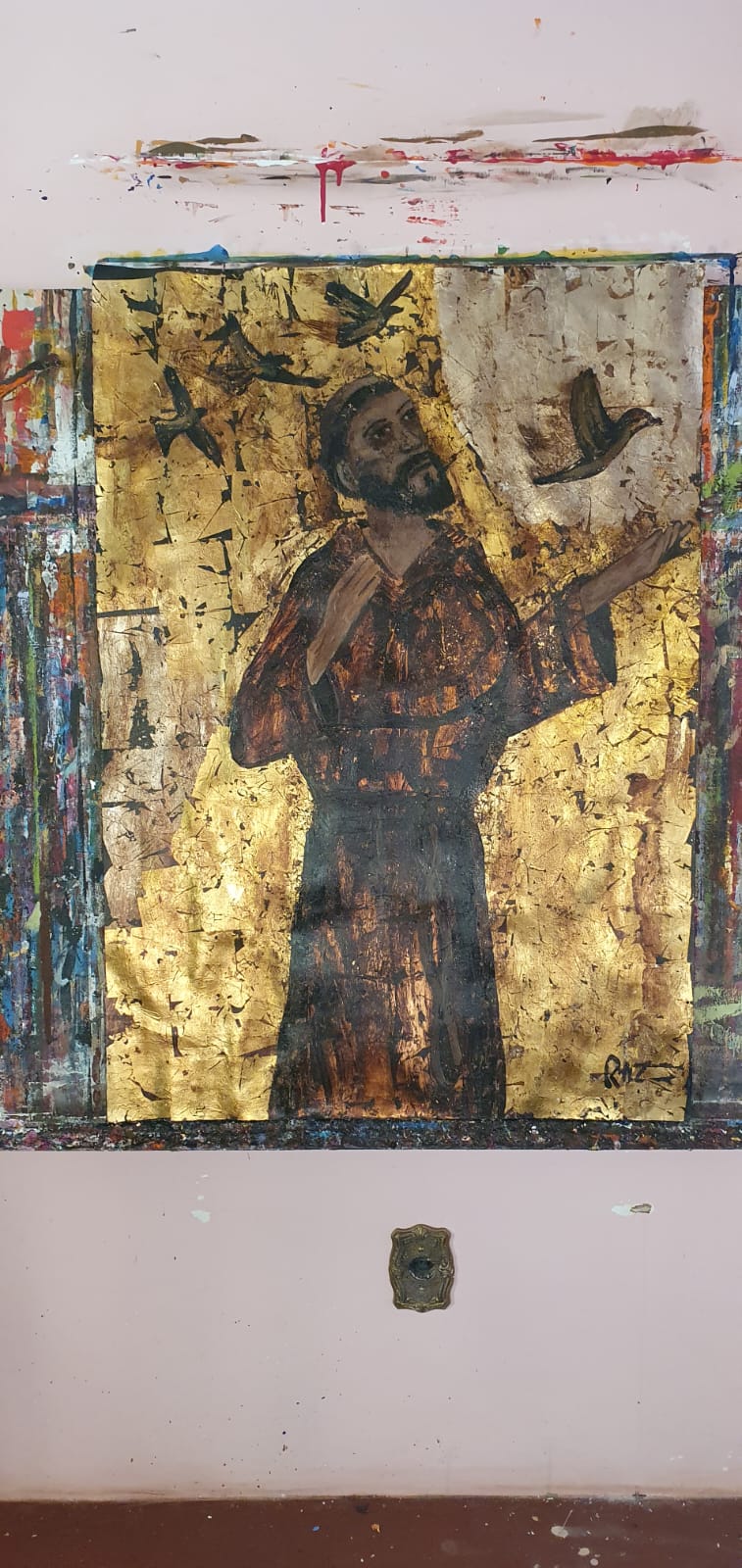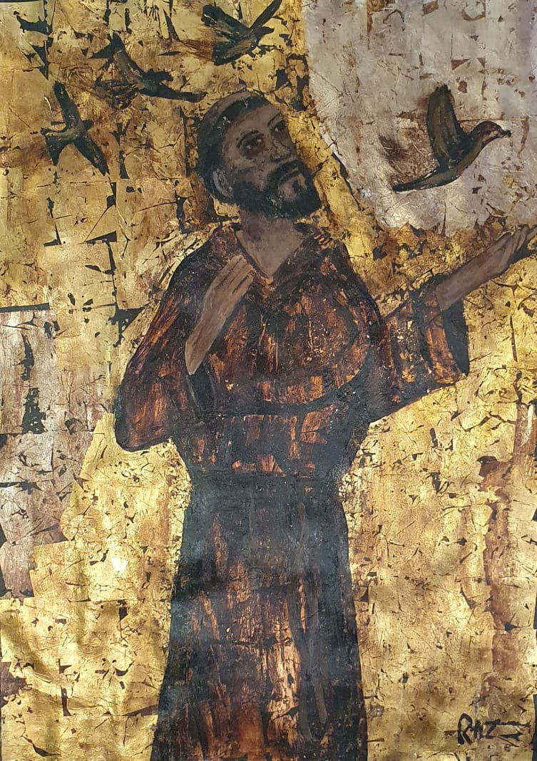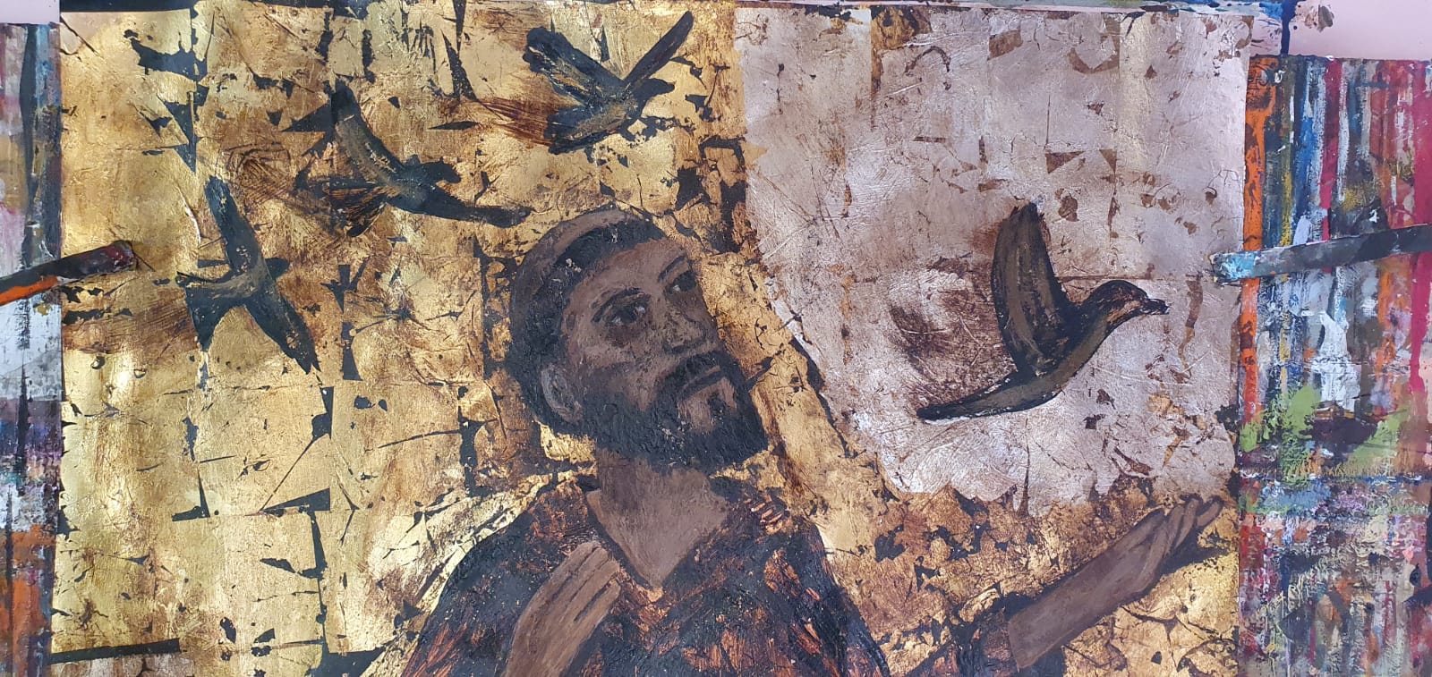 Folha de ouro, prata e bronze; betume e tinta acrílica em papel.